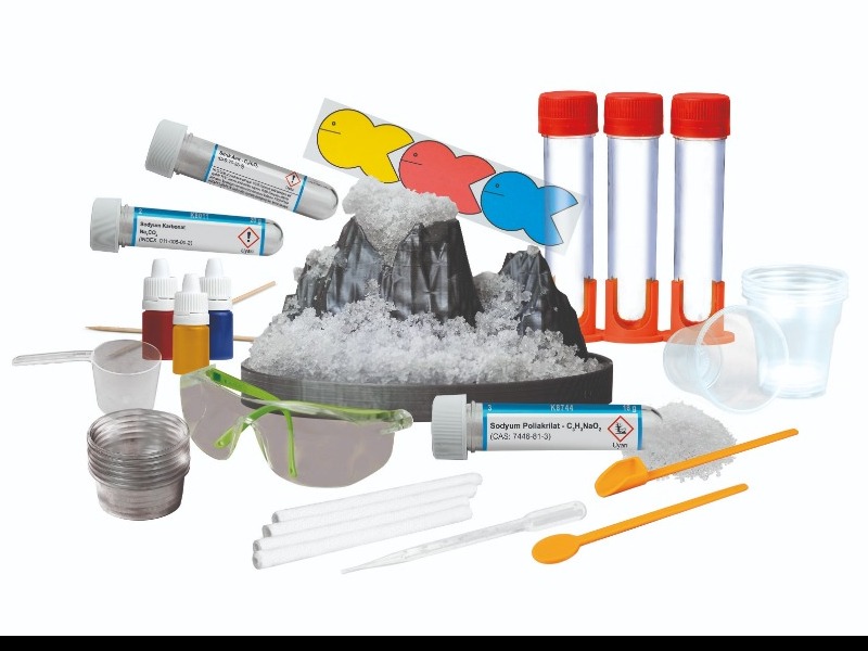 Set içeriğinde bulunan volkanik dağ modeli, deney kaşığı ve tüp standı, nişasta bazlı doğal biyo-polimerden üretilmiştir.