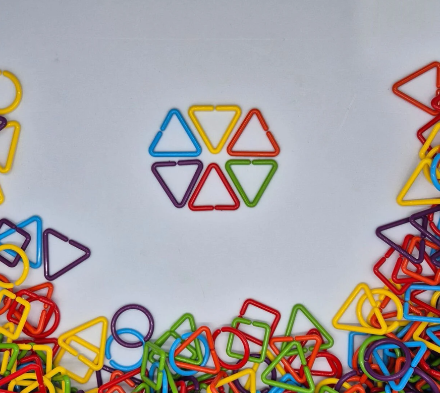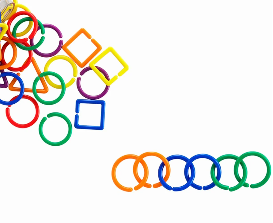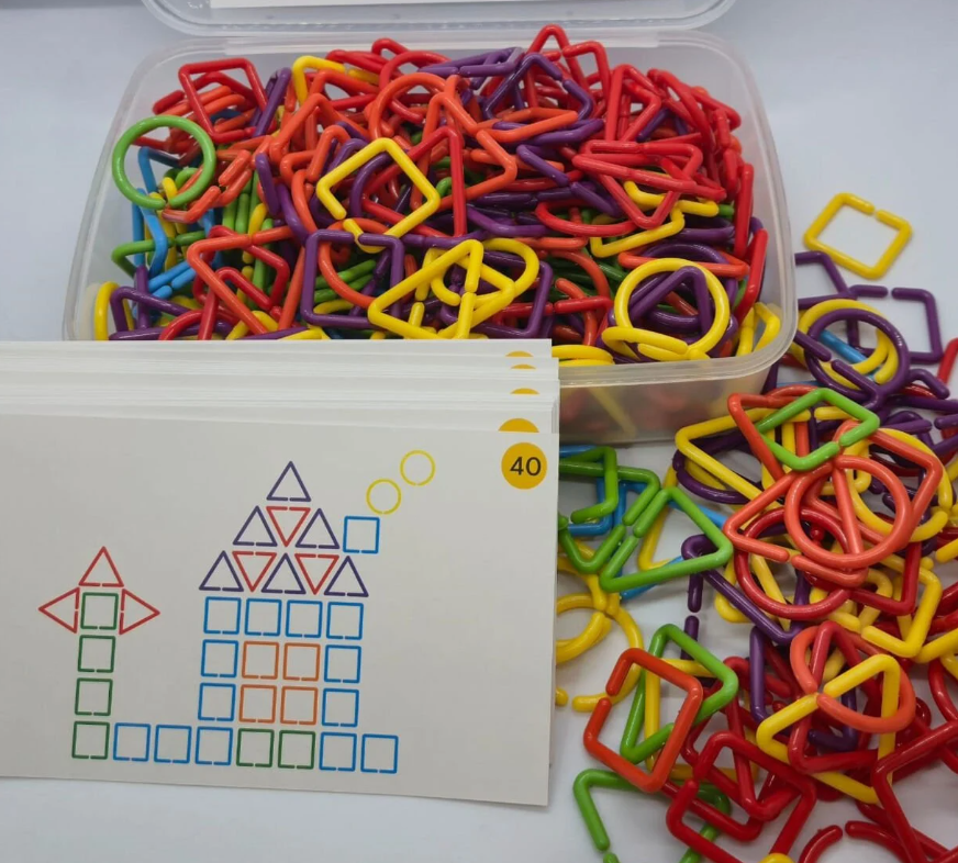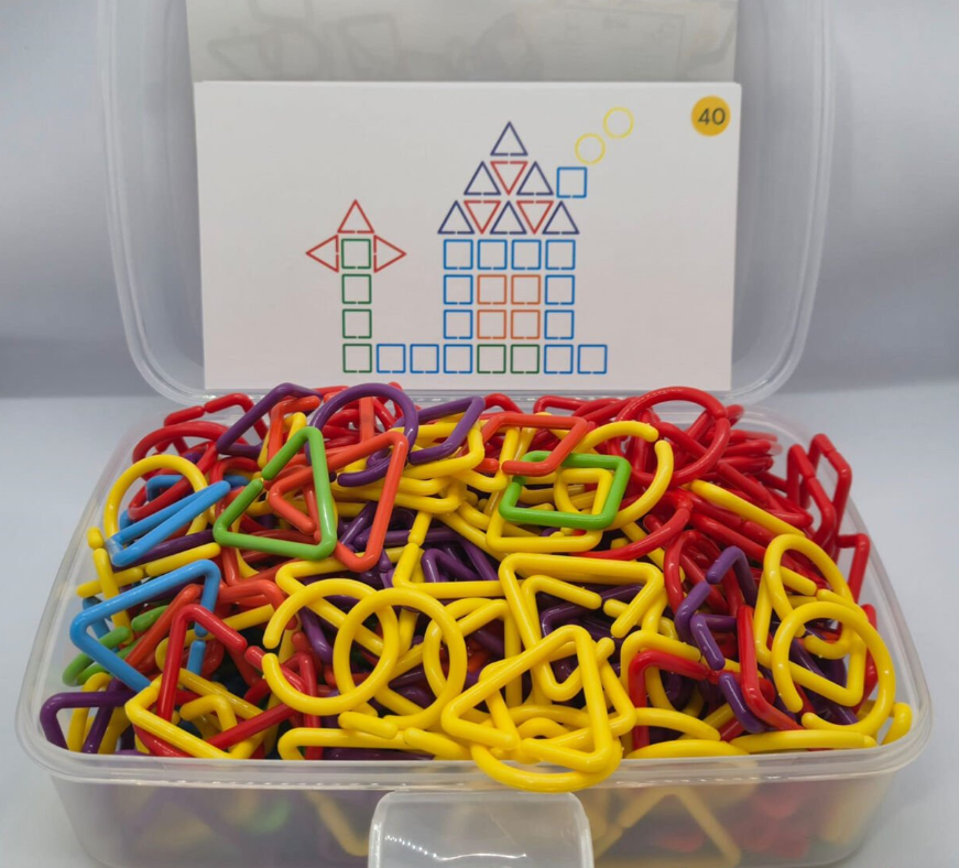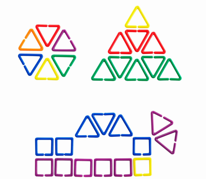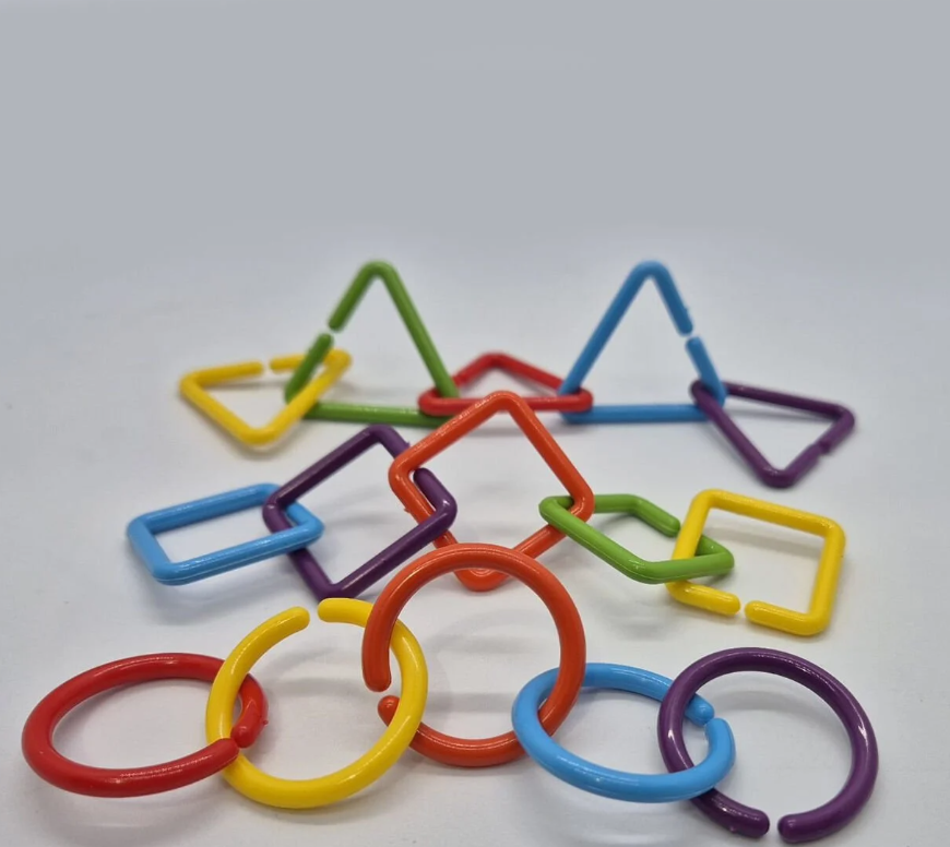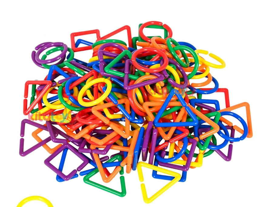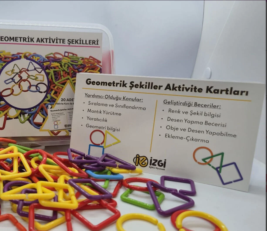 Daire, üçgen, kare gibi farklı geometrik formlarda ve canlı renklerde üretilmiştir. Her bir parça kolayca birbirine geçebilir, bu sayede çocuklar farklı şekiller, zincirler ve yapılar oluşturabilirler.